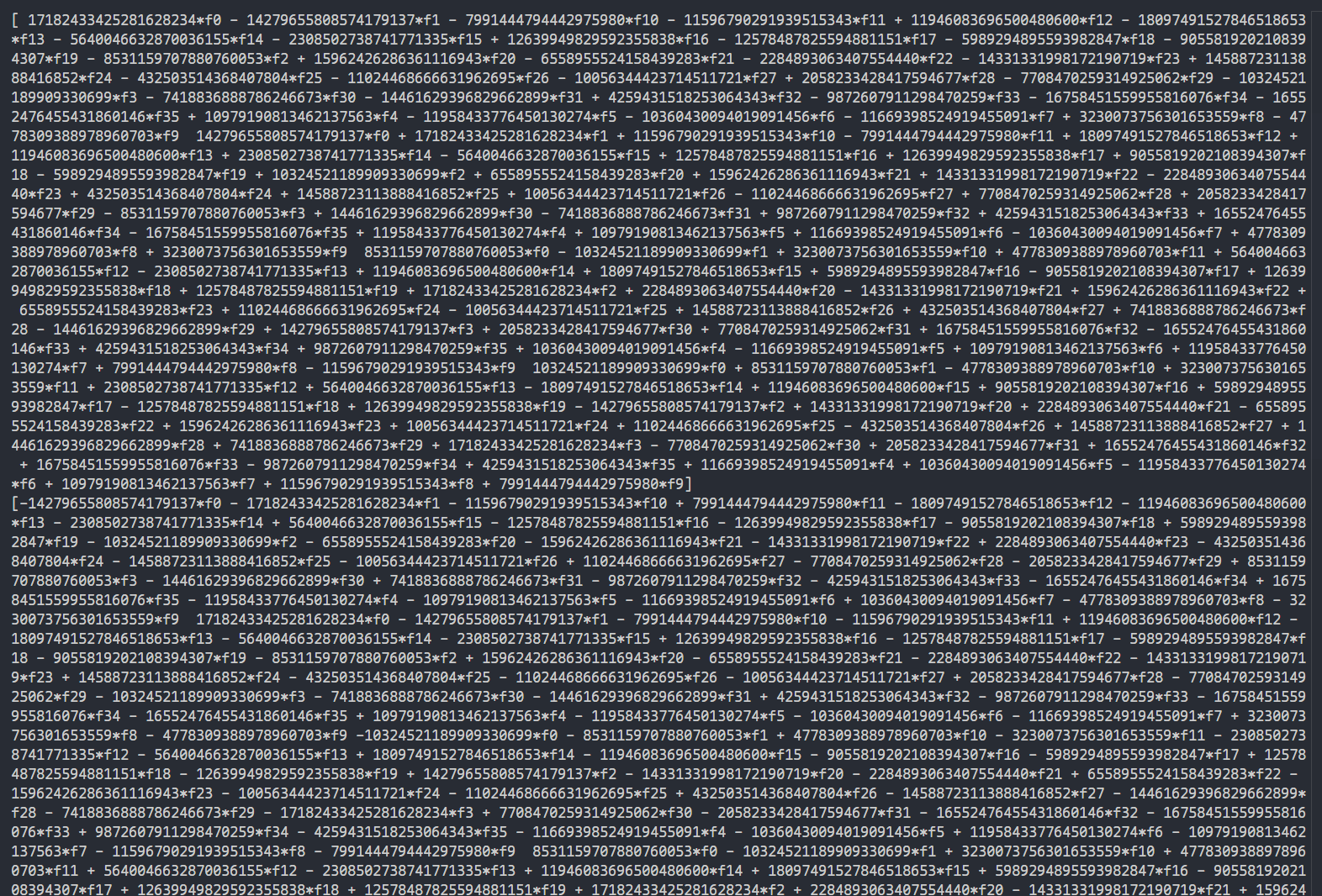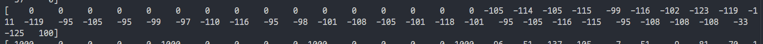 \[ \begin{bmatrix} 0 & \dots & 0 & f_0 & f_1 & \dots & f_{35} & 100 \end{bmatrix} \]with 16 zeroes before the flag characters. Sure enough, when we look through the reduced basis, we find something similar: