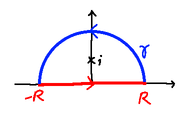 \[ \oint_{C} f(z) dz = \int_{-R}^{R} f(x) dx + \int_{\gamma} f(z) dz \]